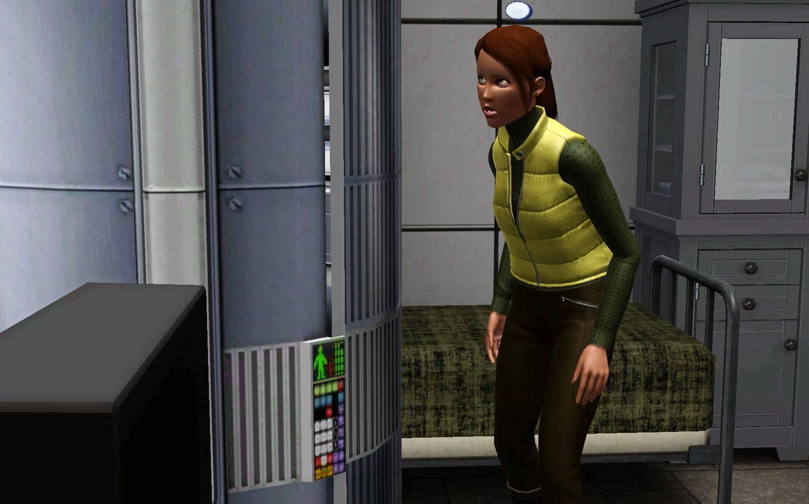 I use the access card given to me with my work orders to go inside this 'restricted' area designated "RESEARCH LAB" on my card. Inside is a huge, dark room filled with supply crates, strange looking equipment, a couple computers, and a few tables covered with medical tools. Only one single light on the wall near a table shows me where to go. I'm really confused by the lack of other sims around and wonder if I'm in the wrong place. I notice a datapad on the table with my name on it...
